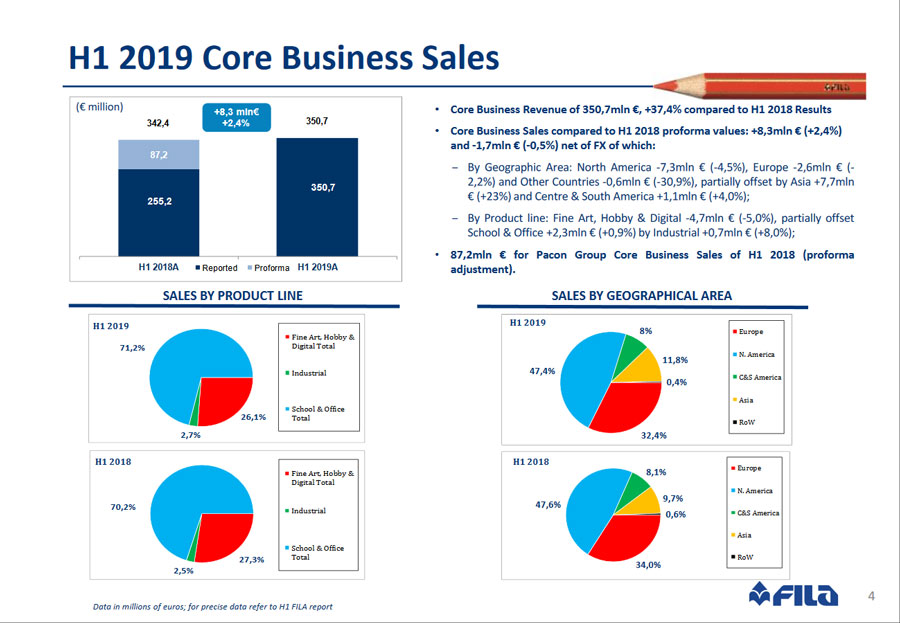 Ad Agosto, FILA ha comunicato i risultati economici del primo semestre del 2019, periodo chiuso con ricavi normalizzati della gestione caratteristica per 350,7 milioni di euro, in aumento del 37,4% rispetto ai 255,19 milioni ottenuti nei primi sei mesi dello scorso anno, grazie all’acquisizione del gruppo Pacon.
