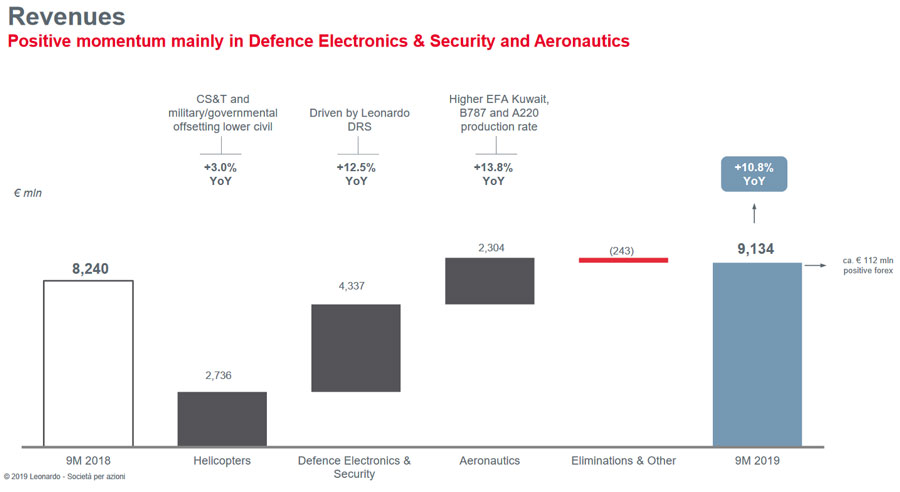 Nei primi nove mesi dell’anno, infatti, la società ha registrato nuovi ordini per quasi 8,58 miliardi di euro, in calo nominalmente ma in forte crescita al netto dell’effetto che nel terzo trimestre 2018 era stato legato al contratto da 3 miliardi di euro per la fornitura di elicotteri NH90 al Qatar. Il portafoglio ordini ha così raggiunto i 35.672 milioni di euro di controvalore, pari ad una produzione equivalente di circa 3 anni.
