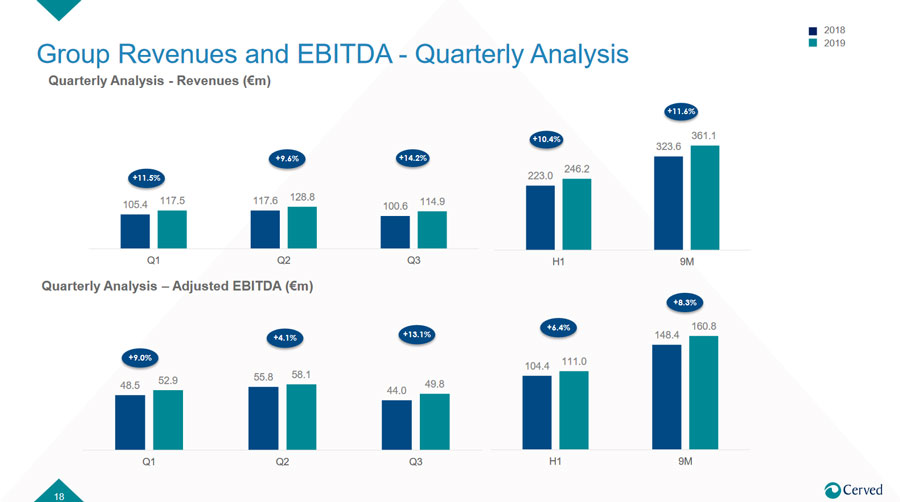 Nei primi nove mesi del 2019 il Gruppo Cerved ha continuato ad ottenere risultati in forte crescita, con i Ricavi che aumentano del 12%, l’EBITDA Adjusted del 8%, l’Operating Cash Flow del 13%, l’Utile Netto Adjusted del 16%, e il rapporto di leverage che cala ulteriormente a 2,4x l’EBITDA Adjusted.
