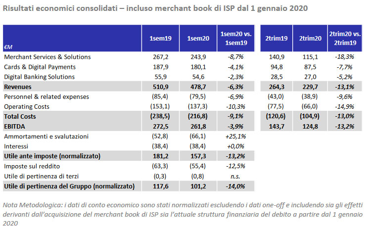 NEXI ha precisato che il dato del giro d’affari comprende il contributo derivante dall’acquisizione del merchant book di IntesaSanpaolo; su base standalone i ricavi sarebbero scesi dell’8,5%.