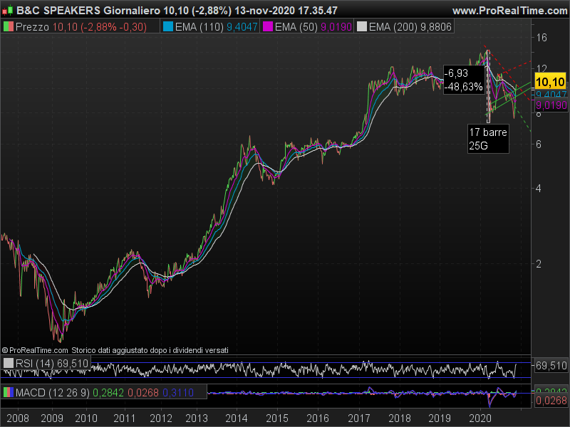 Nessuno sa quando si potrà tornare alla normalità, ma le quotazioni di B&C Speakers scontano uno scenario pessimistico. Il titolo potrebbe quindi iniziare a recuperare terreno anche prima che gli effetti della pandemia presentino evidenti segnali di migloramento.