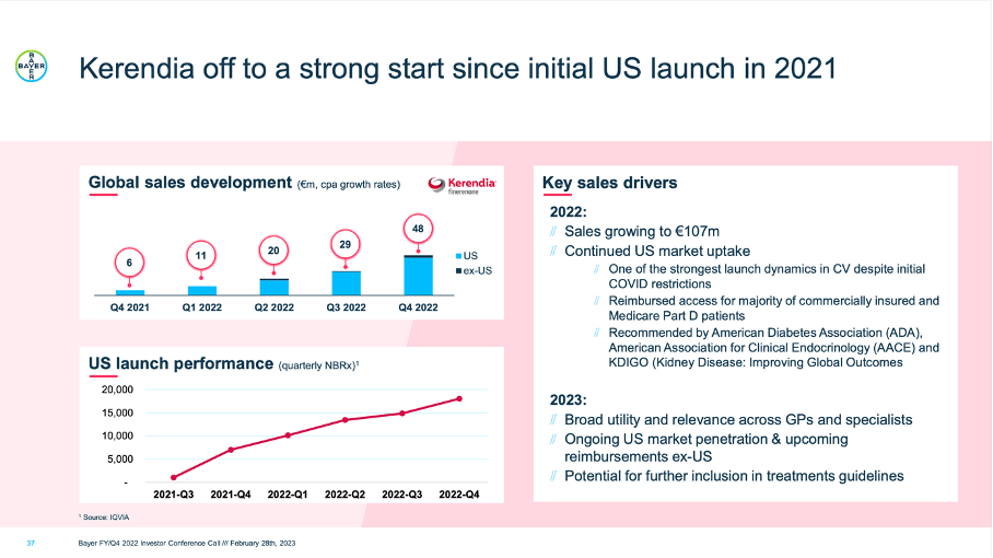 Bayer Pharma, tranite Guth, ha elencato diversi potenziali prodotti di successo nella sua area di ricerca. Si aspetta un picco di vendite di 12 miliardi di euro dal farmaco antitumorale Nubeqa, dal farmaco per i reni Kerendia e da due dei prodotti chiave in cantiere, quali il farmaco sperimentale per l’ictus Asundexian e il farmaco sperimentale per la salute delle donne Elinzanetant. Prevede inoltre che più della metà di tali vendite proverrà proprio dagli Stati Uniti.