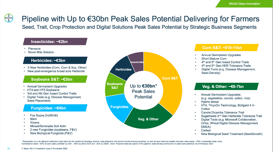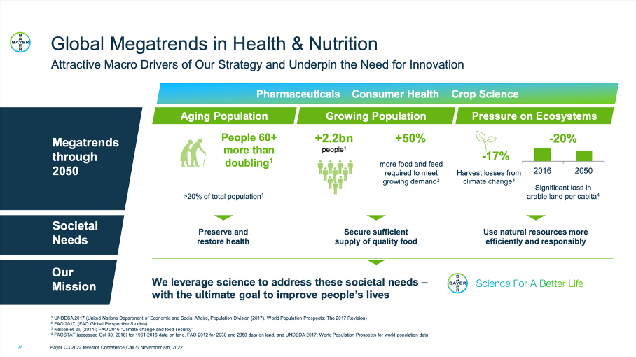 La crescita e l’invecchiamento della popolazione porteranno a una maggiore domanda di cibo e per produrre queste quantità di cibo sono necessari i prodotti della scienza delle colture di Bayer. Fino al 2050, la popolazione dovrebbe crescere di 2,2 miliardi di persone e per soddisfare la domanda è necessario circa il 50% in più di cibo. E non solo il segmento della scienza delle colture ne trarrà profitto, ma anche il segmento farmaceutico. Il numero di persone sopra i 60 anni dovrebbe più che raddoppiare e nel 2050 le persone sopra i 60 anni rappresenteranno più del 20% della popolazione totale. Ciò porterà a un aumento della domanda di prodotti farmaceutici nei prossimi decenni.